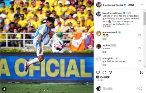 阿根廷后卫利桑德罗在社交媒体上晒出比赛照片,并写道:“抬起头来!这不是我们来到这里想要的结果,但我们已经拼尽全力。几周后见。”